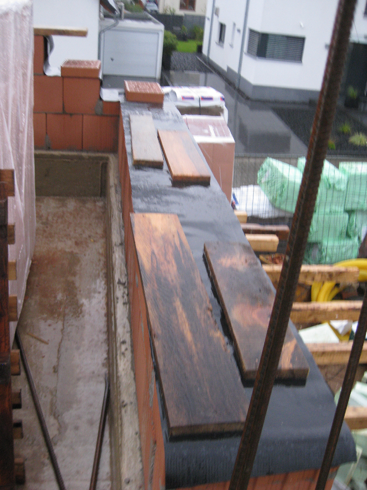 Tragende Wände im Obergeschoß entstehen 26. August 2014RohbauSt. … Und die offenen Steine sind auch wieder gegen den beharrlichen Regen abgedeckt. Na also…